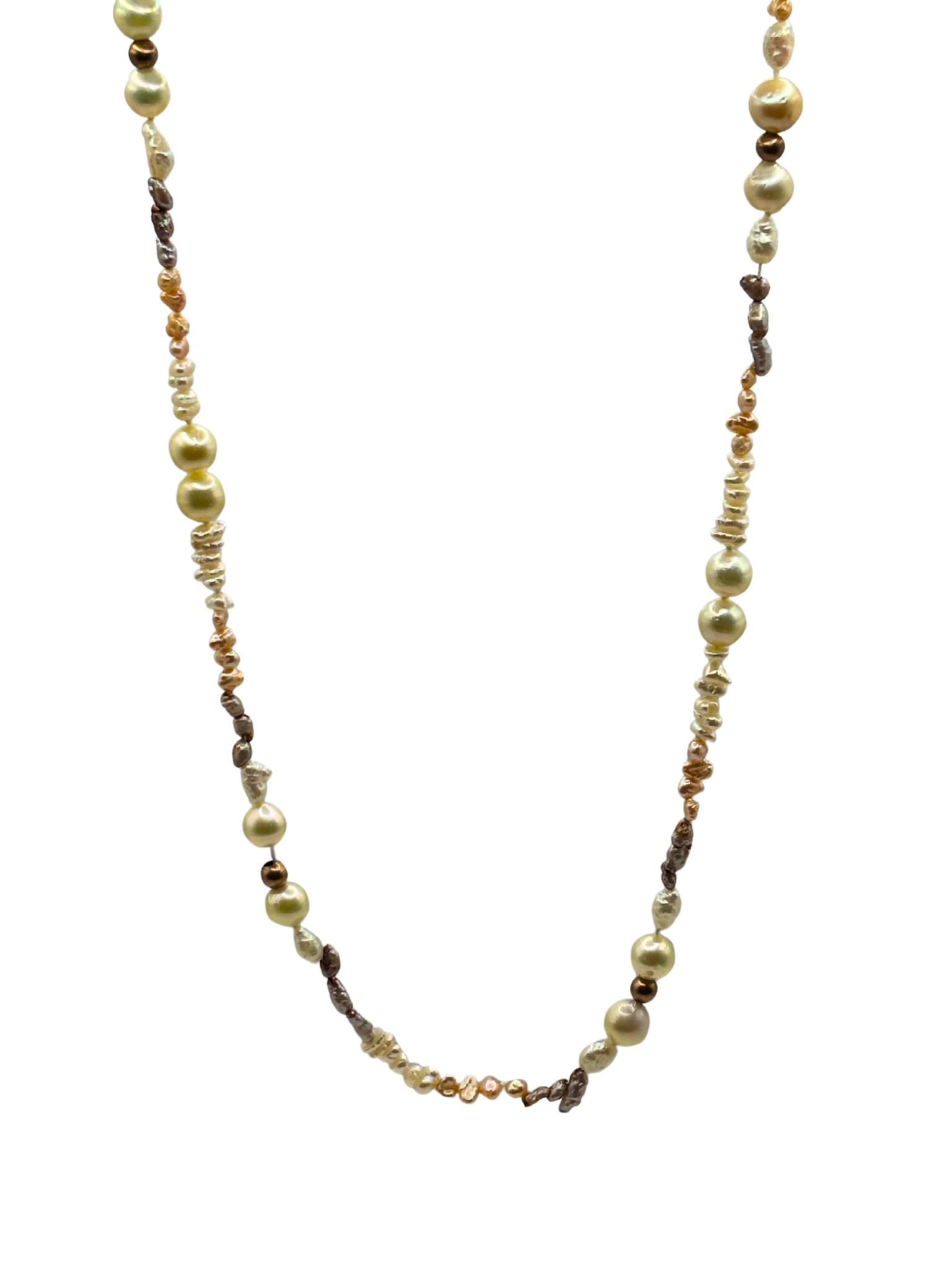 This unique 51cm necklace features multi-colour potato-shaped pearls, also known as baroque pearls, in various hues and sizes.