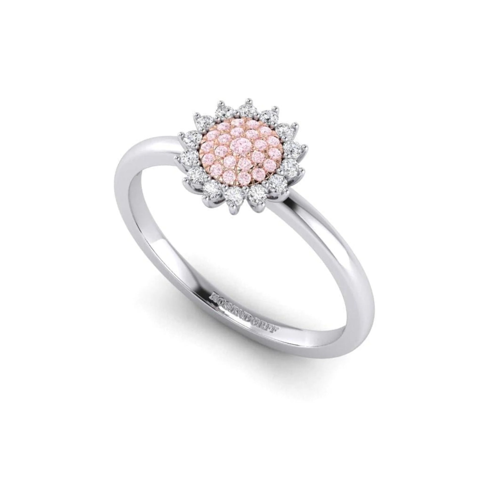 Inspired by the vibrant and cheerful sunflower, this ring features rare pink diamonds surrounded by a delicate, petal-like halo of white diamonds in gorgeous three-claw settings. This ring is the perfect way to bring a touch of sunshine to your jewellery collection.