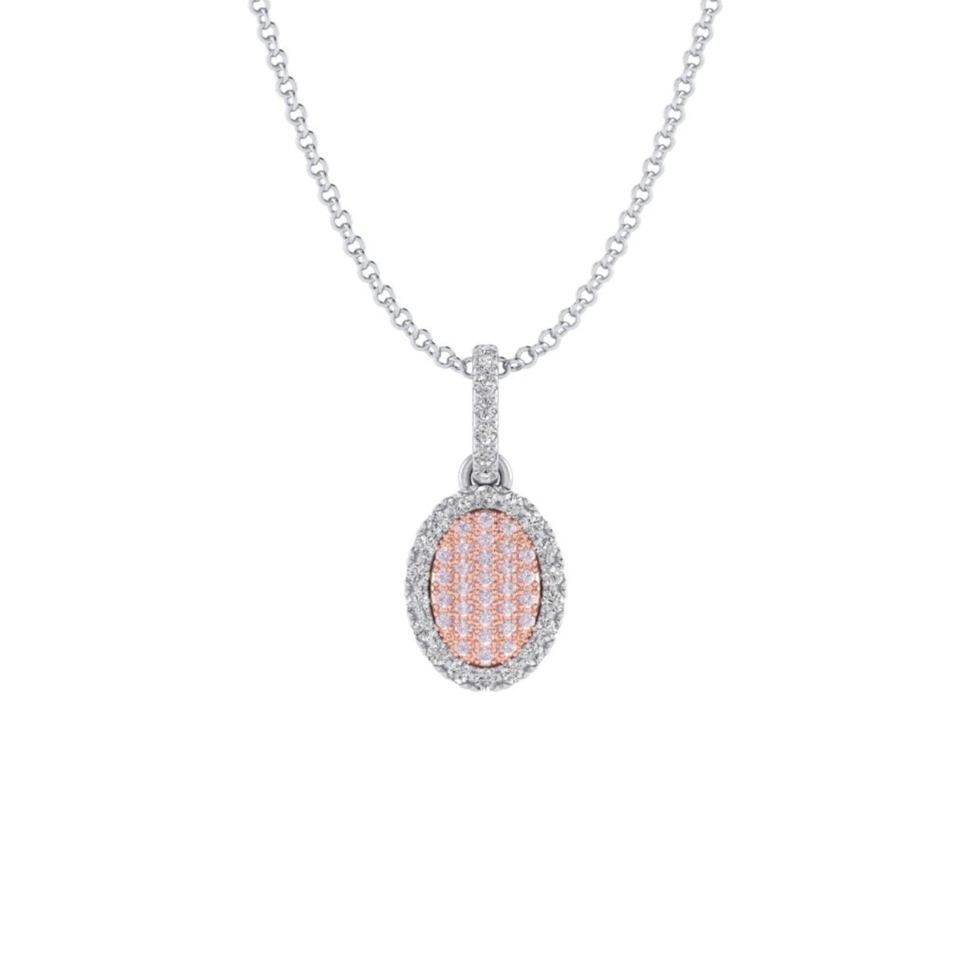 This beautiful pendant features shimmering pink diamonds in a pavé setting at its centre, surrounded by a halo of white diamonds. The bail diamonds add an extra sparkle to the piece, creating a magnificent jewellery piece. This pendant comes with a 45cm chain.