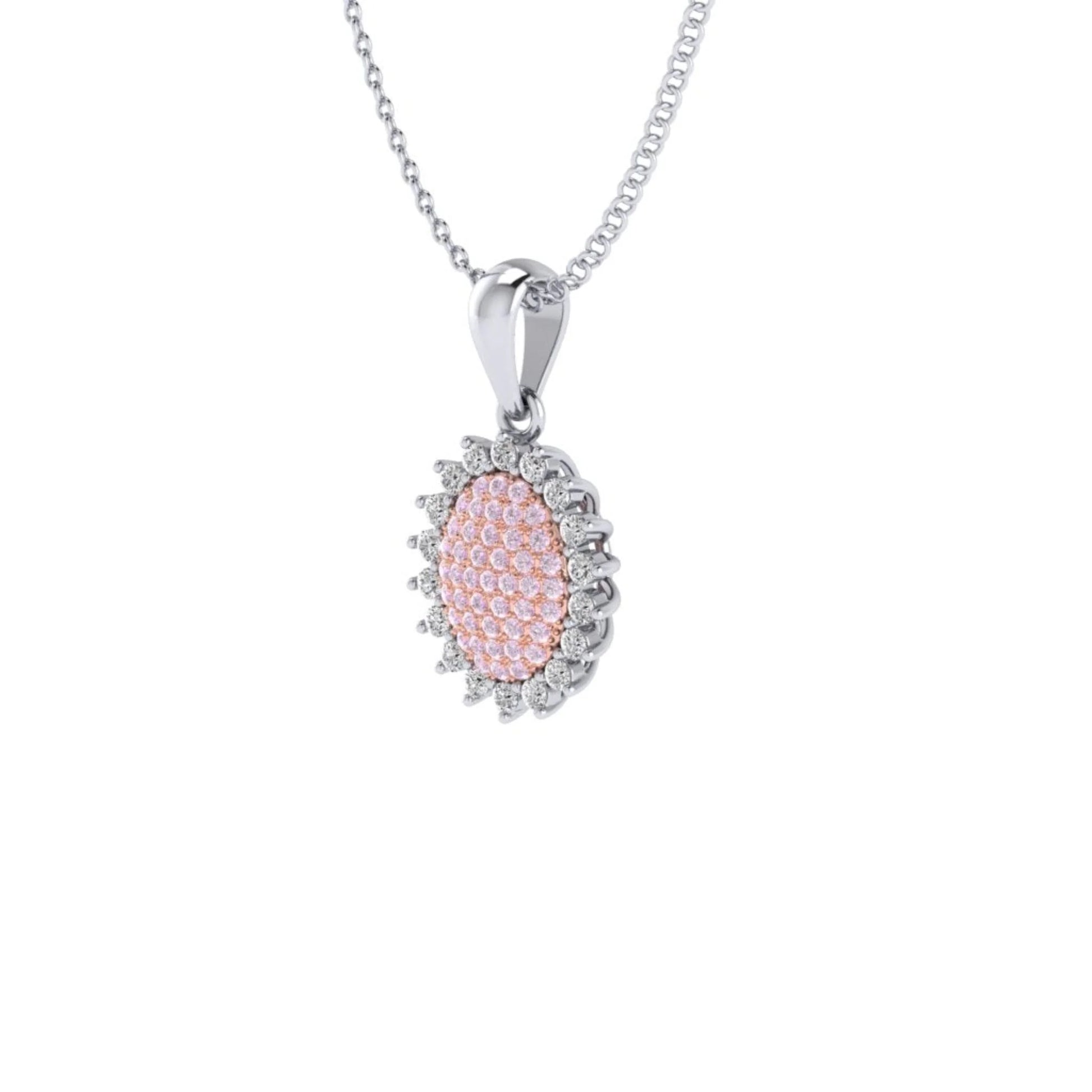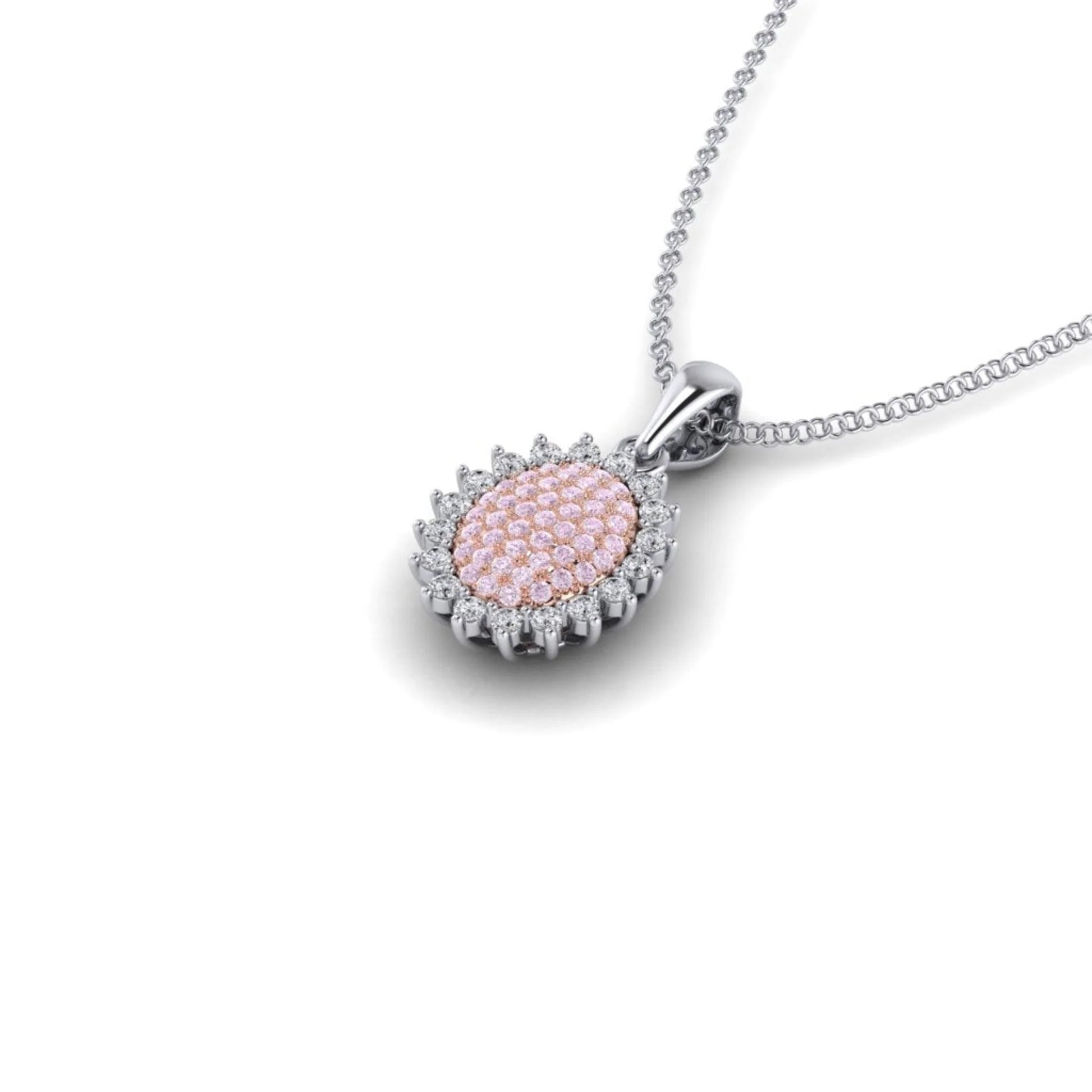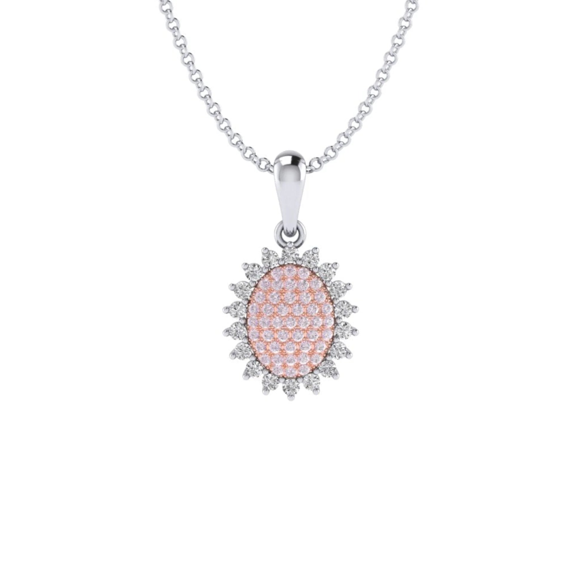 This stunning pendant features an oval sunflower design with Pink diamonds from the Argyle mine in Western Australia. The petals are crafted from 18 white diamonds, adding extra sparkle and creating a beautiful contrast with the pink diamonds. A magnificent piece of jewellery and a perfect way to add a touch of nature-inspired luxury to your look. This pendant comes with a 45cm chain