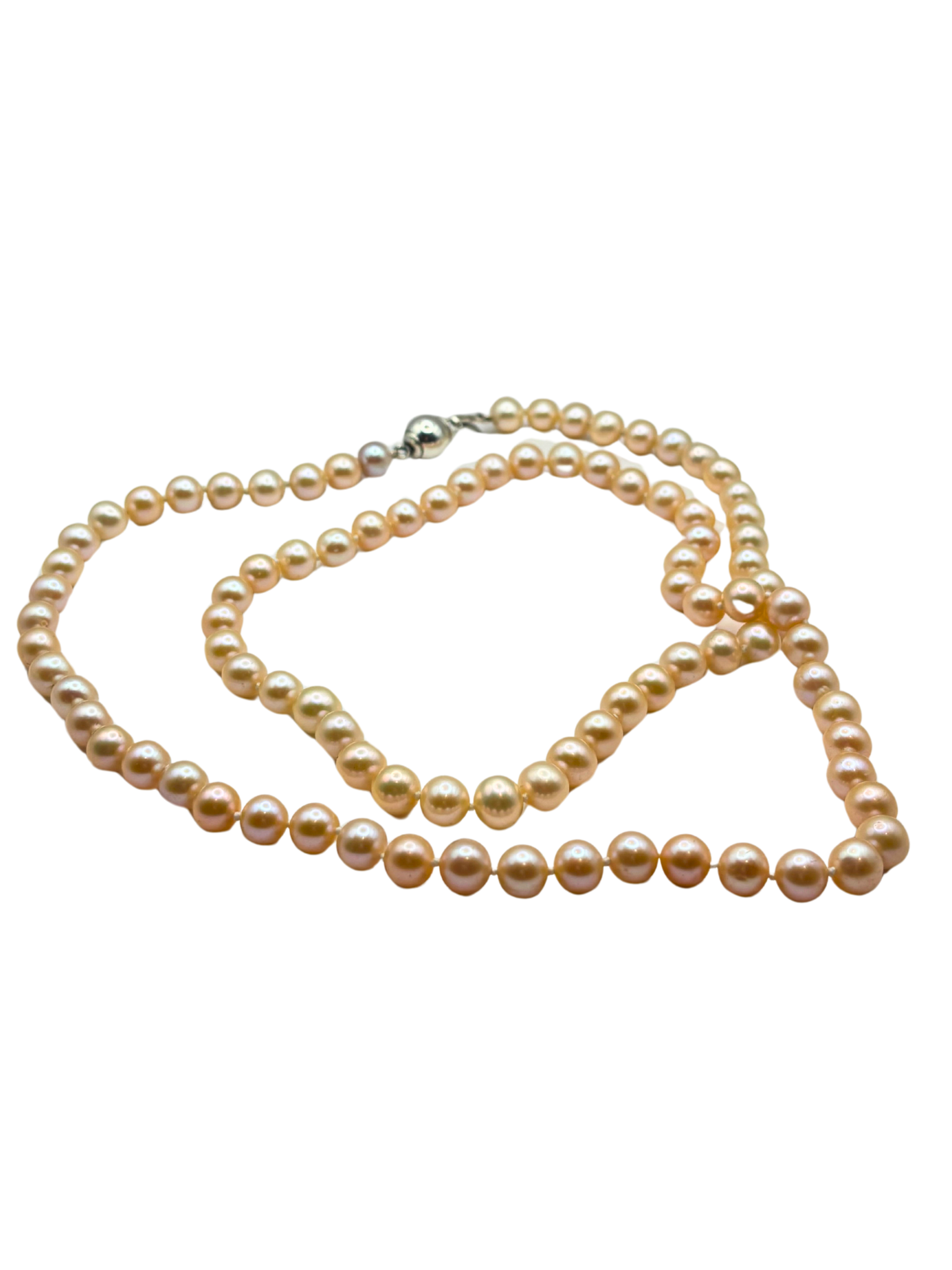 This elegant necklace features high-quality creme freshwater pearls with a pink tone and a lustrous finish, carefully selected for their beauty and durability.